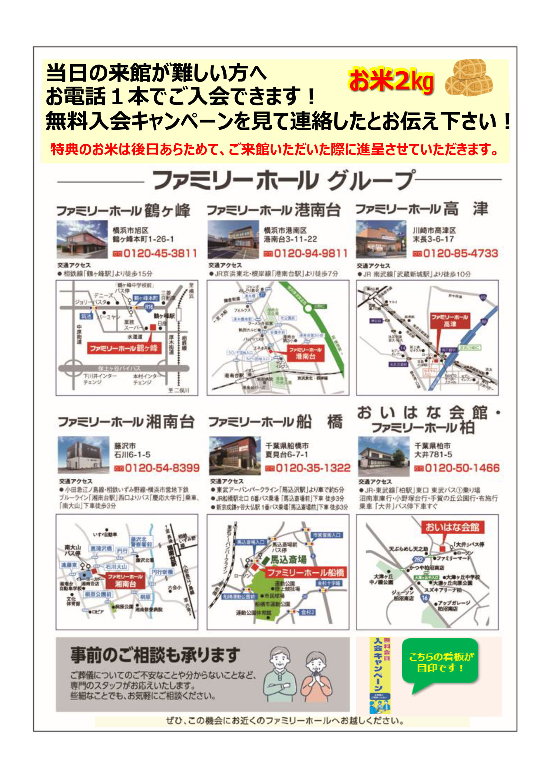 3/7(土)、8(日)、12(木)、13(金)、21(土)、22(日)、26(木)、27(金)限定で、入会金無料に加えてエンディングノート、お米2㎏をプレゼントいたします。